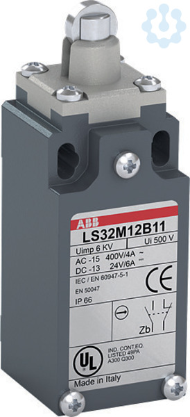 LS33M12B11 ist ein 30 mm breiter Positionsschalter aus einer Zinklegierung (Zamak), mit 2 Befestigungsbohrungen oben, 1 Kabeleinführung nach ISO M20x1,5 unten, einem abgeflachten Stahl-Rollendruckbolzen (verzinkt) sowie 1 Schließer + 1 Öffner als Sprungkontakt