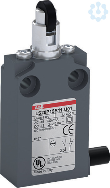 LS20P15B11-U01 ist ein 30 mm breiter, kompakter Positionsschalter aus glasfaserverstärktem UL-V0-Material, mit 2 Befestigungsbohrungen M4 oben, einem vorverdrahteten UL62 - PVC-Kabel (1 m) an der Seite, einem abgeflachten Kunststoff-Rollendruckbolzen sowie 1 Schließer + 1 Öffner als Sprungkontakt