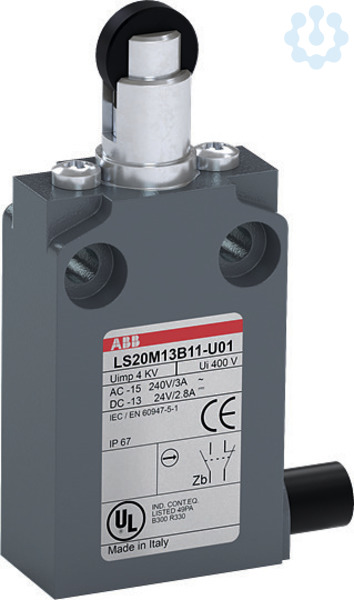 LS20M13B11-U01 ist ein 30 mm breiter, kompakter Positionsschalter aus Zinklegierungsmaterial (Zamak), mit 2 Befestigungsbohrungen M4 oben, einem vorverdrahteten UL62 - PVC-Kabel (1 m) an der Seite, einem abgeflachten Kunststoff-Rollendruckbolzen sowie 1 Öffner + 1 Schließer als Sprungkontakt