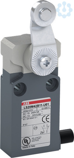 LS20M42B11-U01 ist ein 30 mm breiter, kompakter Positionsschalter aus Zinklegierungsmaterial (Zamak), mit 2 Befestigungsbohrungen M4 oben, einem vorverdrahteten UL62 - PVC-Kabel (1 m) an der Seite, einem abgeflachten Stahl-Rollendruckbolzen sowie 1 Öffner + 1 Schließer als Sprungkontakt
