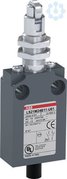 LS21M24B11-U01 ist ein 30 mm breiter, kompakter Positionsschalter aus Zinklegierungsmaterial (Zamak), mit 2 Befestigungsbohrungen M4 oben, einem vorverdrahteten UL62 - PVC-Kabel (1 m) an der Seite, einem abgeflachten Stahl-Rollendruckbolzen sowie 1 Öffner + 1 Schließer als Sprungkontakt