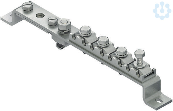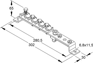 Potentialausgleichsschiene, ohne Abdeckung, zur Sicherstellung des Potentialausgleichs nach DIN VDE 0100 Teile 410/540 und den Blitzschutzpotentialausgleich nach DIN VDE 0185. Abmessungen (ca. Maße) H x B x L : 65 x 30 x 302 mm Anschlussmöglichkeiten : 8 x 4 -25 mm² 1 Bandeisen bis 40 x 4 mm 1 Rundleiter Ø 8 - 10 mm Werkstoff Schiene und Klemmlasche : Stahl, tauchverzinkt Werkstoff Anschlußklemme : Zinkdruckguss Werkstoff Druckstück und Klemmplatte : Stahlguß, tauchfeuerverzinkt Werkstoff Schrauben und Muttern : Stahl, verzinkt