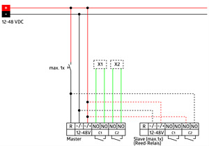 Präsenzmelder mit einer Betriebsspannung von 12-48 V, Zwei potentialfreie Kanäle, Kann sowohl als Master-Gerät als auch als Slave-Gerät genutzt werden, Manuelles Schalten über Taster möglich, Weitere Funktionen über optionale Fernbedienung einstellbar, Weitere Schaltbilder siehe Produktseite auf www.beg-luxomat.com, Werkseinstellung 10 min und 500 Lux (15 min HKL)