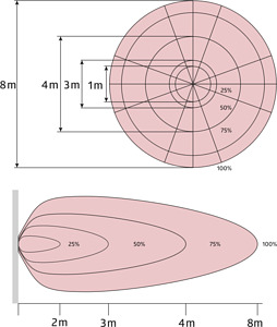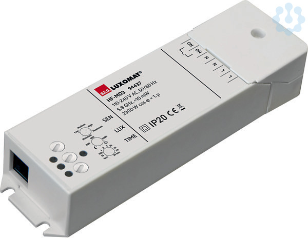 Hochfrequenz-Präsenzmelder für den Innenbereich, Lichtfühler im Gehäuse integriert, Einstellbar über Potentiometer am Gerät, Erweiterbar um externen Lichtfühler mit integriertem IR-Empfänger für Fernbedienbarkeit des Melders, Temperaturunabhängige Detektion, Erfassung durch Glas, Holz und Leichtbauwände