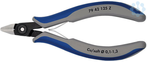 79 42 125 Z Präzisions-Elektronik-Seitenschneider Präzisionszangen für feinste Schneidarbeiten, z. B. in Elektronik und Feinmechanik. Sehr genau geschliffene, scharfe Schneiden mit sehr kleinen Facetten für exakte Schnitte an empfindlichen Elektronik-Bauteilen; auch ohne Facette für bündiges Schneiden. Schneiden zusätzlich induktiv gehärtet, Schneidenhärte ca. 64 HRC. Ca. 20 % weniger Gewicht als konventionelle Elektronikzangen. Geschraubtes Gelenk mit besonders sorgfältig gefertigten Gelenkflächen für gleichmäßige, reibungsarme Bewegung im gesamten Öffnungsbereich. Leichtgängige Doppelfeder für ein sanftes und gleichmäßiges Öffnen. Ergonomisch optimierte Mehrkomponenten-Hüllen. für ein optimiert flächenbündiges Schnittergebnis an weichen Materialien. für Montagen mit engen Toleranzen, für präzise Drahtenden-Konfiguration. - Schneidwerte weicher Draht (Durchmesser): Ø 0,1 – 1,3mm - Backenlänge (B): 11mm - Backendicke (am Gelenk) (D): 6,5mm - Kopfbreite (A): 11mm