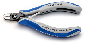 79 02 125 S1 Präzisions-Elektronik-Seitenschneider Präzisionszangen für feinste Schneidarbeiten, z. B. in Elektronik und Feinmechanik. Sehr genau geschliffene, scharfe Schneiden mit sehr kleinen Facetten für exakte Schnitte an empfindlichen Elektronik-Bauteilen; auch ohne Facette für bündiges Schneiden. Schneiden zusätzlich induktiv gehärtet, Schneidenhärte ca. 64 HRC. Ca. 20 % weniger Gewicht als konventionelle Elektronikzangen. Geschraubtes Gelenk mit besonders sorgfältig gefertigten Gelenkflächen für gleichmäßige, reibungsarme Bewegung im gesamten Öffnungsbereich. Leichtgängige Doppelfeder für ein sanftes und gleichmäßiges Öffnen. Ergonomisch optimierte Mehrkomponenten-Hüllen. runder Kopf. alle Kanten am Kopf verrundet - reduziert das Risiko von Isolationsbeschädigungen bei Korrekturen an Kabelbäumen. - Schneidwerte mittelharter Draht (Durchmesser): Ø 1,3mm - Schneidwerte harter Draht (Durchmesser): Ø 0,7mm - Schneidwerte weicher Draht (Durchmesser): Ø 0,2 – 1,7mm - Backenlänge (B): 10mm - Backendicke (am Gelenk) (D): 6,5mm - Kopfbreite (A): 11mm