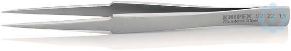 92 22 13 Universalpinzette Die hochwertigen Allrounder: Universalpinzetten bieten ein umfangreiches Spektrum an verschiedenen Griffarten und Spitzenformen. Sie sind antimagnetisch, hoch korrosionsbeständig und eignen sich ideal für alle anspruchsvollen Standardanwendungen. Dauergebrauchstemperatur 350°; Kurzzeit-Temperatur Luft 925°. - Ausführung: Mattiert - Spitzenbreite (B): 0,5mm - Ausführung Pinzettenspitze: Spitz - Korrisionsbeständig: Ja - Branche Feinmechanik: Ja - Branche Medizin: Ja - Branche Wissenschaft: Ja - Branche Lebensmittel: Ja