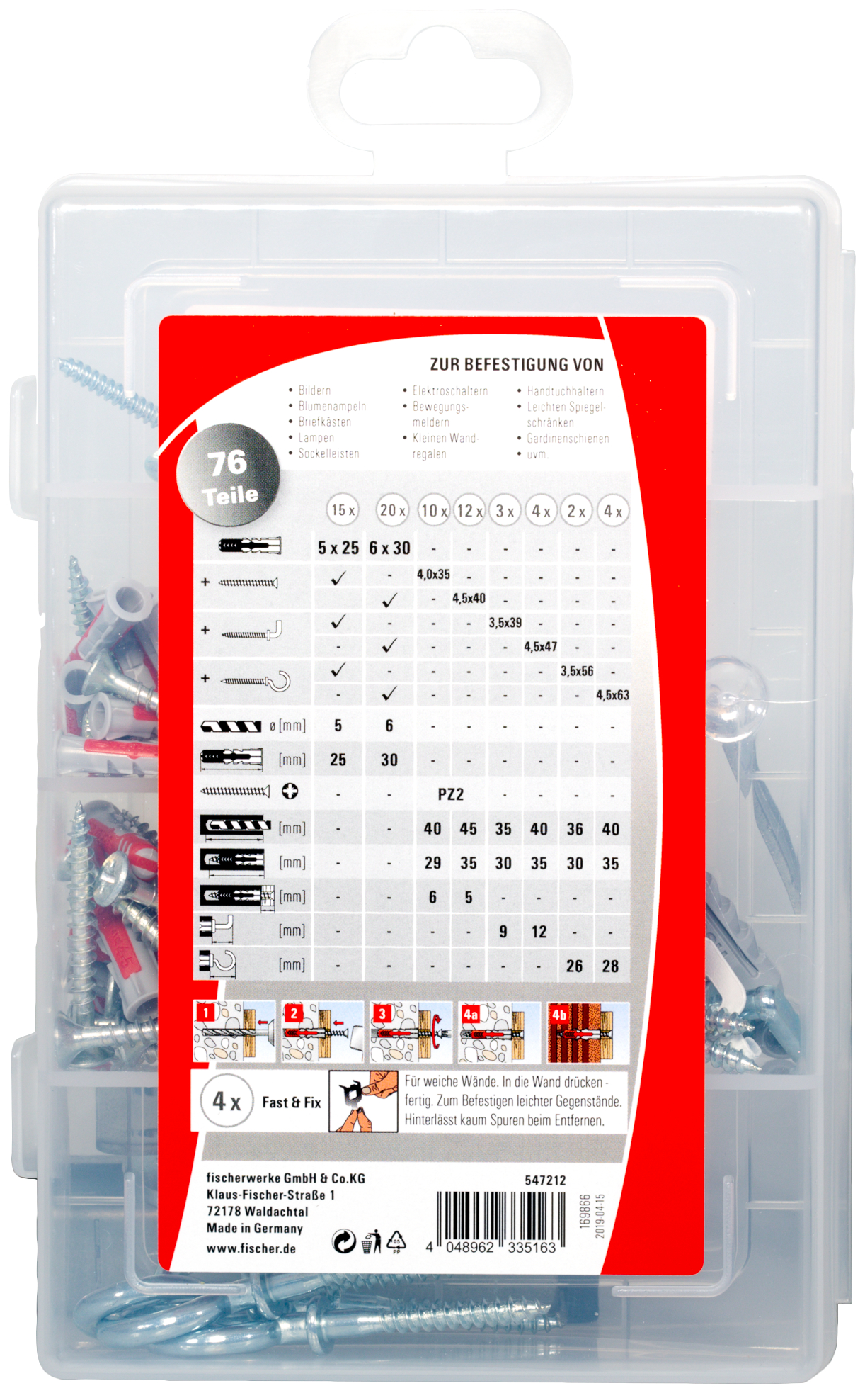 Die fischer Praktische Helfer Box Umziehen & Einziehen enthält vorsortiert 15 DuoPower 5 x 25 und 10 Senkkopfschrauben 3,5 x 35, 3 Winkelhaken 3,5 und 2 Rundhaken 3,5, 20 DuoPower 6 x 30 und 12 Senkkopfschrauben 4,5 x 40, 4 Winkelhaken 4,5 und 4 Rundhaken 4,5, 4 Bildhaken Fast & Fix in weiß, 1 Bit PZ 2 und 1 Flaschenöffner SX. Die aus hochwertigem und schlagfestem Kunststoff gefertigte Box ist ideal für alle Befestigungslösungen rund ums Umziehen und Einziehen. Der transparente Deckel ermöglicht die Übersicht auf einen Blick. Die Praktische Helfer Box verschließt sich fest und kann wieder mit Dübeln befüllt werden.