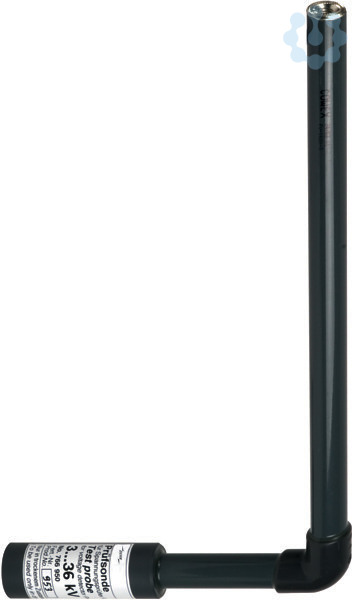 Prüfsonde, 90° abgewinkelt für Schaltanlagen, bei denen das Erreichen der Prüfkontakte über einen Durchlass (Tulpe) nur von unten nach oben möglich ist. Zum Aufschrauben auf die Prüfspitzen der Spannungsprüfer PHE III und PHE.