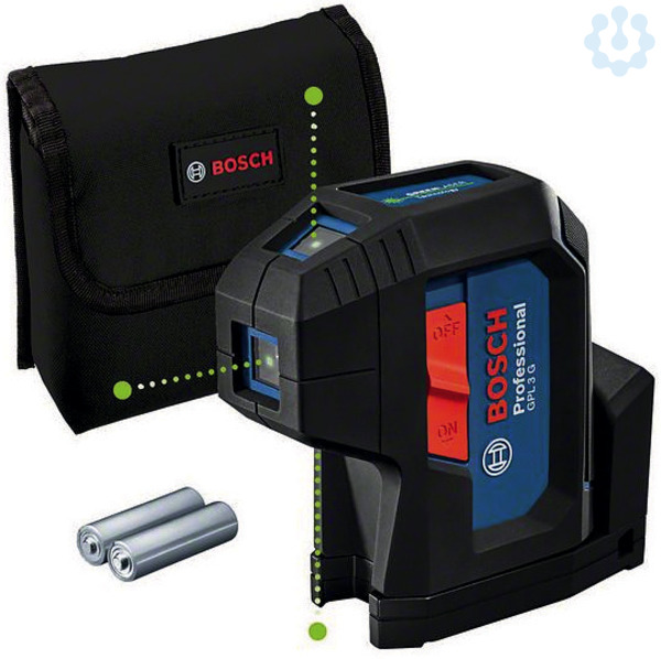 Punktlaser GPL 3 G. Durch sein strapazierfähiges und kleines Design eignet sich der 3-Punkt-Laser GPL 3 G Professional ideal für den Trockenbau. Seine grünen Laserpunkte bieten eine bis zu viermal bessere Sichtbarkeit als rote Punkte. Mit seinem gummiummantelten Gehäuse und dem eingelassenen Glas sowie Staub- und Strahlwasserschutz nach IP 65 hält der GPL 3 G Professional auch rauen Baustellenbedingungen stand. Dieser 3-Punkt-Laser ist mit einer eingebauten Drehhalterung mit starken Magneten ausgestattet, dies ermöglicht eine schnelle und sichere Werkzeugbefestigung und einen bequemen Transport. Der GPL 3 G Professional ist der ideale Helfer für die Übertragung von Referenzpunkten vom Boden zur Decke, z. B. bei der Installation von Innenraumbeleuchtung. Durch seine Formgebung eignet er sich perfekt für die Ausrichtung von Trockenwandunterkonstruktionen. Dieser 3-Punkt-Laser verfügt auch über ein benutzerfreundliches Interface mit einem Zweipositionsschalter: Beim Einschalten nivelliert der Laser sich automatisch selbst, beim Ausschalten wird die Pendelarretierung aktiviert. Im Lieferumfang enthalten: Tasche, 2x 1,5 V LR6-Batterie (AA)