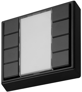 vitaLED® Tastelement, 8-fach, schwarz. In Verbindung mit dem vitaLED®-Steuergerät 18300000 und dem Busankoppler 18310000 können mit diesem Tastelement folgende Funktionen abgerufen werden (die jeweilige Ansteuerungs- möglichkeit variiert je nach Einstellung der Mastersteuerung): • Unabhängige Helligkeitssteuerung aller vier Farben (RGBW) • Speichern von 2 individuellen Farbwerten • Abrufen von voreingestellten Farbtemperaturen (2.000 K - 10.000 K) • Abrufen von 11 Farbverläufen / Farbpartituden • Stufenlose Geschwindigkeitsregelung der Farbverläufe / Farb- partituden Drei Farbverläufe: 1. RGB (schnell) rot, grün, blau, türkis, violett, gelb, weiß 2. RGB (sanft) blau, türkis, violett, rot, pink, gelb, grün, weiß, weiß-blau 3. RGBW (sanft) rot, rot-weiß, weiß-gelb, gelb, grün, grün-weiß, weiß-blau, türkis, blau, violett, violett-weiß, weiß Vier Farbpartituden: 1. Farbfrische | 2. Abendrot | 3. Frühlingserwachen | 4. Biorhythmus Material: Kunststoff / Stahl, Umgebungstemperatur (ta): 0 °C bis +45 °C, geeignet zum Einbau in Hohlwand- und Unterputzdosen (Ø 68 mm), Maße: L 81 x B 81 x T 25 mm Zusätzlich benötigt: 2-adrige Leitung (z.B. J-Y(St)Y) maximal 30 m als Verbindung zum Busankoppler 18310000. . Schutzart raumseitig: nach DIN EN 60529: IP20.