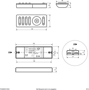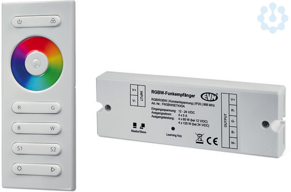 Funk-Controller-Set für RGB- und RGBW LED-Leuchten. Neben der Farbsteuerung ist es über das Set auch möglich die Leuchte zu dimmen, oder ein- und aus zu schalten. Ebenso können verschiedene Farbwechselmodi, sowie die gewünschte Geschwindigkeit für den Farbwechsel gesteuert werden. Die Farbwahl über den Handsender erfolgt mittels Touch-Farbrad, wobei die Grundfarben rot, grün, blau und weiß auch direkt angewählt werden können. Außerdem können 2 Szenen fest gespeichert werden. Geeignet für 12 und 24V/DC Leuchten. Anschlüsse: 1x Eingang und 4x Ausgang (+RGBW). Maximale Ausgangsleistung je Kanal: 5A, 60W bei 12V/DC und 120W bei 24V/DC. Beim Einsatz mehrerer Sets innerhalb eines Raumes können diese als Master-Slave-Anwendung synchron gesteuert werden. Es können bis zu 20 Empfänger auf einen Handsender und bis zu 5 Handsender auf einen Empfänger eingelernt werden. ta: 0-40°C.