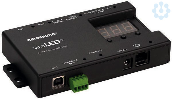 vitaLED® Mastersteuerung. Diese vitaLED®-Mastersteuerung dient zur individuellen oder vorprogrammierten Farb- und Helligkeitssteuerung von vitaLED-Leuchten, -Einsätzen und -Flexplatinen. Die Steuerungsmöglichkeiten im RGBW-Farbraum werden über die verwendete Schnittstelle (digital / analog) definiert. Externe Schnittstellen: DALI, DMX, 4 x 1-10 V oder Taster (potentialfrei) Produkterweiterung über interne Schnittstellen vitaLED-BUS: zur Ansteuerung von 2-, 4- oder 8-fach-Taster (benötigtes Zubehör: Busankoppler 18310000) Data OUT: zur Ansteuerung von vitaLED®-Leuchten über Leuchten-Verteiler 18301000 und / oder vitaLED®-Flexplatinen über den PWM-Verteiler 18302000 Maße: L 153 x B 102 x H 26 mm, Umgebungstemperatur (ta): 0 °C bis +45 °C, Material: Kunststoff Die Mastersteuerung ist geeignet zur Hutschienenmontage (9 Teilungseinheiten). Bei einer Verbindungslänge zwischen Master und Verteiler von mehr als 20 m ist der Master über das Netzgerät Art. 18313000 mit einer Spannung von 24 V DC zu versorgen! Eine Systemaufstellung für zusätzlich benötigte vitaLED®-Komponenten finden sie auf Seite 504. . Ausführung: Plug&Play, Schutzart raumseitig: nach DIN EN 60529: IP20, Schutzklasse: (EN 61140) III, Spannung: 12V 24V, Art der Dimmung: DALI.