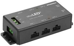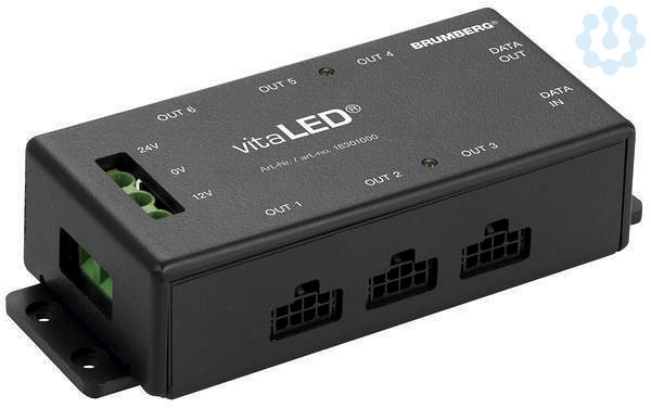 vitaLED® Leuchten-Verteiler, 6-fach. Dieser vitaLED®-Verteiler ist die Leistungseinheit zwischen dem vitaLED®-Master und vitaLED®-Leuchten bzw. vitaLED®-Einsätzen. Es können max. 6 Leuchten / LED-Module über vitaLED®- Systemstecker an einen Verteiler angeschlossen werden. Länge der Datenleitungen zwischen den vitaLED®-Verteilern (Data IN / Data OUT): maximal 50 m. Material: Kunststoff, Umgebungstemperatur (ta): 0 °C bis +45 °C, Strom: max. 10 A. Leistung: max. 120 W bei 12 V | max. 240 W bei 24 V, Maße: L 126 x B 54 x H 31 mm Geeignet zur Hutschienenmontage (7,5 Teilungseinheiten). Eine Systemaufstellung für benötigte vitaLED®-Systemkomponenten finden sie auf Seite 504. . Ausführung: Plug&Play, Schutzart raumseitig: nach DIN EN 60529: IP20, Schutzklasse: (EN 61140) III, Spannung: 12V 24V.