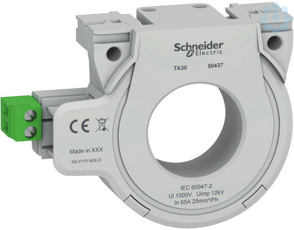 Dieser Ringkern ist für die Vigilohm Isolationsfehlersuchgeräte und die VigiPacT-Fehlerstromschutz- und Überwachungsrelais vom Typ A bestimmt. Es ermöglicht die Überwachung der eingespeisten Komponente von Vigilohm Insulation Monitor und die Messung eines Nennstroms bis zu 65A für VigiPacT Überwachungs- und Schutzrelais. Das Übertragungsverhältnis beträgt 1/1000. Der Innendurchmesser des Toroids beträgt 30 Millimeter und das Gewicht 0,120 kg. Die Kabel müssen innerhalb des Toroids zentriert sein, und der Durchmesser aller Kabel darf 15 mm nicht überschreiten. Der maximale Querschnitt pro Phase (R, S, T, N) beträgt 25mm² für einen Kupferleiter.