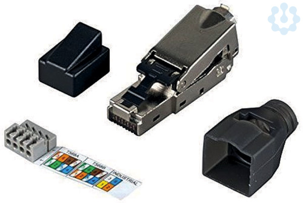 Feldkonfektionierbarer RJ45 Steckverbinder, Cat.6A, ISO IEC 11801, TIA568-C.2, Geschirmt Metall mit Zinklegierung, Kontakte Phosphor-Bronze-Legierung, 3 µm vergoldet, Litze oder starre Ader, Abmessung typ. AWG22-27, fuer 6-9 mm Kabelmantel