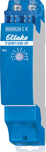 Gateway mit IP-Schnittstelle für Baureihe 14-Stromzähler über WLAN. Stand-by-Verlust nur 0,8 Watt. Reiheneinbaugerät für Montage auf Tragschiene DIN-EN 60715 TH35. 1 Teilungseinheit = 18mm breit, 58mm tief. Das Gateway ist nur 1 TE breit: Für den Betrieb muss das Gateway in ein WLAN eingebunden werden. Die WLAN-Verbindung nutzt das 2.4 GHz Frequenzband. Anschluss an den Eltako-RS485-Bus. Querverdrahtung Bus und Stromversorgung mit Steckbrücke. Betrieb in Verbindung mit FAM14 oder FTS14KS. Die Hold-Klemme wird mit dem FAM14 oder FTS14KS verbunden. Die IP-Verbindung erfolgt über WLAN. Das Gateway überträgt Daten von beliebigen Eltako-Stromzählern am RS485-Bus über das MQTT-Protokoll. Die Daten werden vom RS485-Bus an einen beliebigen externen MQTT-Broker übertragen. Für mehr Details zu MQTT siehe: www.mqtt.org. Die Daten sind gemäß dem EnOcean over IP-Format codiert, siehe: www.enocean-alliance.org/specifications/ Konfigurationen und Updates erfolgen über die Eltako Connect-App oder über ein Webinterface. Eine REST-API steht über die Online-Produktseite des Gerätes zur Verfügung.