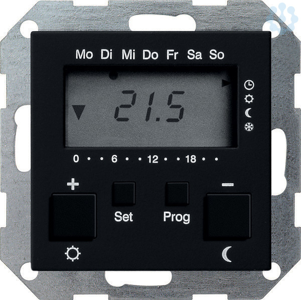 Raumtemperaturregler 230 V~ mit Uhr und Kühlfunktion System 55 Schwarz matt Merkmale: Elektronischer Raumtemperaturregler mit integrierter Zeitschaltuhr für die temperaturgeführte Einzelraumregelung. Über den geschalteten Ausgang können z. B. Heizungen direkt angesteuert werden. Automatische Umschaltung der Betriebsarten "Heizen" oder "Kühlen" über separaten Eingang. Raumtemperaturregelung über einen internen Temperatursensor und oder externen Temperaturfühler als Raumtemperaturregler, als Fußbodentemperatur-Regler oder als Fußbodentemperatur-Begrenzer. Zeitprogramm mit bis zu 32 Schaltpunkten (werkseitig vorprogrammierte Standardeinstellung). Separartes Programm für Kühlfunktion. Partyfunktion zum Verlängern der Komforttemperatur um eine, zwei, drei Stunden oder bis zum nächsten Schaltpunkt. Energiesparfunktion zum manuellen Aktivieren der Nachtabsenkung bis zum nächsten Schaltpunkt. Automatische Sommer- bzw. Winterzeitumstellung. Umschaltbar 12- oder 24-Stundenanzeige. Selbstlernende Aufheizoptimierung. Urlaubsabsenkung über Datumseingabe. Innerhalb einer Stunde Dauerheizen unterbricht der Raumtemperaturregler automatisch für 5 min den Heizvorgang (die Heizung wird ausgeschaltet). Hinweise : Fernfühler für die Messung bzw. Regelung der Fußbodentemperatur optional erhältlich.