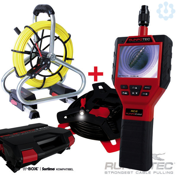 RUNPOCAM RC2 Multifunktionskamera mit Spule inkl. Monitorhalterung im Systemkoffer. 3.5 TFT LCD Display, Akkudauerbetrieb bis zu 6 Std. Beweissicherung/Speicherfunktion: Foto-, Video- und Audio. KAMERAKOPF mit 6 integrierten LED (Schutzklasse IP 67), eingefasst in robustem Edelstahlkopf (Ø 13 mm) mit RTG Ø 6 mm Innengewinde. Kompatibel zu allen RUNPOTEC Produkten mit Gewinde RTG Ø 6 mm. Generell eignet sich die RUNPOCAM RC 2 für Rohrinspektionen über lange Distanzen bis zu 50 m. Ab 14 mm Innendurchmesser (entspricht Leerrohr- Ø 20 mm), aber auch für größere Rohrquerschnitte (Lüftungsanlagen, Drainagen, Abwasserrohre usw.).Profi-Set Glasfaserstab Ø 4,5 mm 10057: Länge 50 Meter mit Gewinde RTG Ø 6 mm und Doppelauslaufsystem (automatische Auslaufbremse und Schnellauslauf), Feststellbremse, ausziehbare Standfüße und Staufach für das Zubehör. Glasfaserstab-Zuglast 1300 kg, Gesamtbruchlast 220 kg Optimales Einsatzgebiet mit Profi-Set Ø 4,5 mm: für Rohrdurchmesser 30mm-80mm
