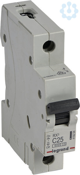 Legrand Leitungsschutzschalter RX3 nach EN 60898-1, VDE 0641-11, EN 60947-2, 1-polig, C-Charakteristik, Bemessungsstrom In 25 A, Bemessungsschaltvermögen Icn 6 kA nach EN 60898-1, Bemessungsspannung Un 230/400 VAC, Bemessungsfrequenz 50/60 Hz, Energiebegrenzungsklasse 3, Befestigung auf Hutprofilschiene EN 60715 durch eine rastende Schnellbefestigung, klare Information vorne auf jedem Gerät, Kennzeichnung Schaltstellungsanzeige On/Off, mit Beschriftungsfeld, Anbau von Hilfsgeräten nicht möglich. Leitungsschutzschalter mit C-Charakteristik sind für den Leitungsschutz bei Geräten mit hohen Einschaltströmen (z.B. Motoren und Transformatoren) vorgesehen.