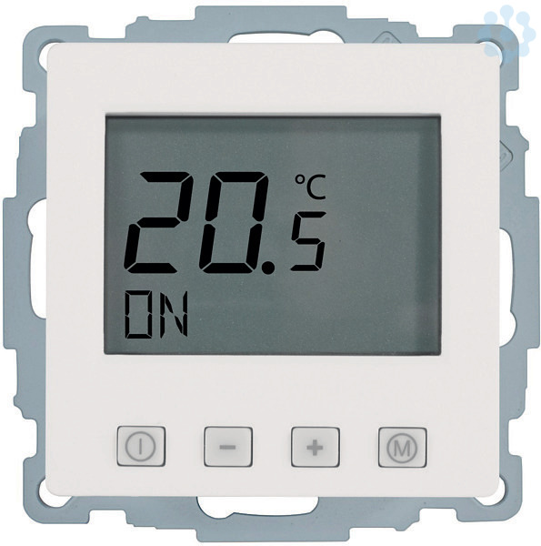 Raumtemperaturregler u.P. Digital, zur Regelung der Raumtemperatur und gleichzeitiger Begrenzung der Fußbodentemperatur, ohne Zeitschaltuhr, großes, beleuchtetes Display, einschl. Zentralscheibe, ohne Abdeckrahmen, einfache Bedienung, Ist- und Solltemperaturanzeige, 10(4)A, 230V, einschl. Fühler (NTC, 33kOhm bei 25°C) mit 4,00 m Leitung, ohne Fühlerhülse, Umstellmöglichkeit auf Heizen/Kühlen-Funktion und auf Schließerkontakt, Farbe: polarweiß samt, ähnlich RAL9010, passend in folgende Schalterprogramme: Berker Q.1, Q.3, Q.7, Q.9