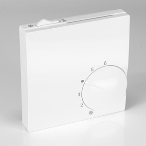 Raumtemperaturregler a.P. 230 V, Ausführung für Heiz- oder Kühlbetrieb über Ein-Rohr-System zur Ansteuerung von Stellantrieb stromlos geschlossen, mit Umschalter Heiz- oder Kühlbetrieb, Wechslerkontakt 5(2)A, Einstellbereich 5...30°C (Skala 1…6), reinweiß glänzend, ähnlich RAL9010, im flachen Gehäuse Abmessungen: 76 x 76 x 18,5 mm