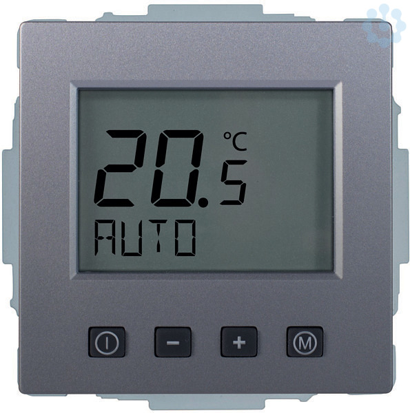 Raumtemperaturregler u.P. Komfort, mit Zeitschaltuhr, großes, beleuchtetes Display, einschl. Zentralscheibe, ohne Abdeckrahmen, einfache Bedienung, Ist- und Solltemperaturanzeige, 10(4)A, 230V, Pumpenschutzfunktion, Umstellmöglichkeit auf Heizen/Kühlen-Funktion und auf Schließerkontakt, selbstlernendes Regelverhalten, Farbe: edelstahlfarbig (lackiert), passend in folgende Schalterprogramme: Busch-Jaeger future, future-linear, solo, axcent, carat, dynasty und pur edelstahl