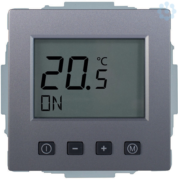 Raumtemperaturregler u.P. Digital, ohne Zeitschaltuhr, großes, beleuchtetes Display, einschl. Zentralscheibe, ohne Abdeckrahmen, einfache Bedienung, Ist- und Solltemperaturanzeige, 10(4)A, 230V, Pumpenschutzfunktion, Umstellmöglichkeit auf Heizen/Kühlen-Funktion und auf Schließerkontakt, Farbe: edelstahlfarbig (lackiert), passend in folgende Schalterprogramme: Busch-Jaeger future, future-linear, solo, axcent, carat, dynasty und pur edelstahl