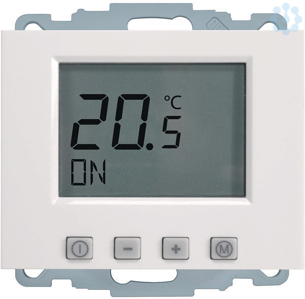 Raumtemperaturregler u.P. Digital, ohne Zeitschaltuhr, großes, beleuchtetes Display, einschl. Zentralscheibe, ohne Abdeckrahmen, einfache Bedienung, Ist- und Solltemperaturanzeige, 10(4)A, 230V, Pumpenschutzfunktion, Umstellmöglichkeit auf Heizen/Kühlen-Funktion und auf Schließerkontakt, Farbe: polarweiß glänzend, ähnlich RAL9010, passend in folgendes Schalterprogramm: Berker Serie K.1, K.5