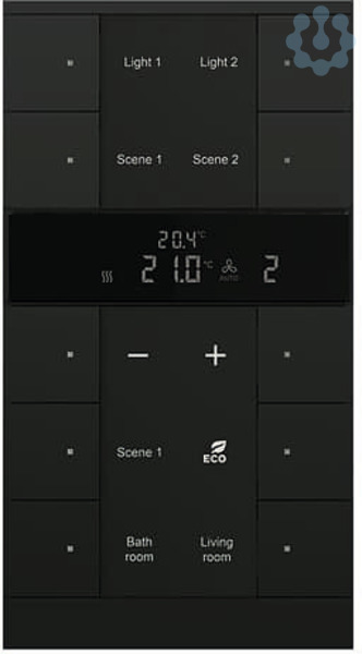 Frei konfigurierbares Multifunktionsbedienelement. Mit integriertem KNX-Busankoppler. Mit Beschriftungsfeld. Unterstützung der KNX-Funktionen durch innovatives Farbkonzept (gelb=Beleuchtung, blau=Jalousie, orange=RTR, magenta=Szene und weiß=neutral/keine Funktionszuordnung) oder Standardbeleuchtung rot/grün. Tasterfunktion: Schalten / Dimmen / Jalousie /Wert senden / Lichtszenen u.a. Master-/Slavebetrieb. Mit Grundlastbetrieb. Der Regler ist ein stetiger Raumtemperaturregler für Ventilator-Konvektoren (Fan Coil) in 2- und 4-Rohr Anlagen und konventionellen Heiz- oder Kühlanlagen Die Lüfterstufe kann manuell oder in den Automatikbetrieb geschaltet werden Klasse des Temperaturreglers: 1 Beitrag zur Raumheizungsenergieeffizienz: 1,0%. Anzahl Busteilnehmer: 1