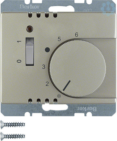 Temp.-Regler mit Öffner, Z.-Stk., Wippsch. u. LED Arsys edelstahl, lackiert. Raumtemperaturregler mit Öffner, Zentralstück, Wippschalter und LED, mit Aufdruck, Regulierknopf mit Temperaturbereichsbegrenzung, mit Ein-/Ausschalter und Kontroll-LED für Ein, mit thermischer Rückführung, mit separatem Anschluss für Nachtabsenkung, z.B. für Stellantriebe stromlos geschlossen, ohne Spreizkrallen, mit Steckklemmen, Neutralleiter erforderlich, wird die eingestellte Temperatur erreicht, öffnet der Kontakt. Unterputz-Installation, Flächen/Designprogramm. Material: Kunststoff, halogenfrei.