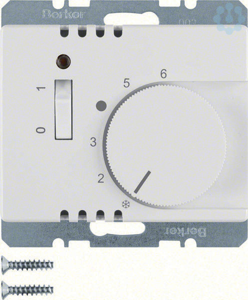 Temp.-Regler mit Öffner, Z.-Stk., Wippsch. u. LED Arsys polarweiß, glänzend. Raumtemperaturregler mit Öffner, Zentralstück, Wippschalter und LED, mit Aufdruck, Regulierknopf mit Temperaturbereichsbegrenzung, mit Ein-/Ausschalter und Kontroll-LED für Ein, mit thermischer Rückführung, mit separatem Anschluss für Nachtabsenkung, z.B. für Stellantriebe stromlos geschlossen, ohne Spreizkrallen, mit Steckklemmen, Neutralleiter erforderlich, wird die eingestellte Temperatur erreicht, öffnet der Kontakt. Unterputz-Installation, Flächen/Designprogramm. Material: Kunststoff, halogenfrei.