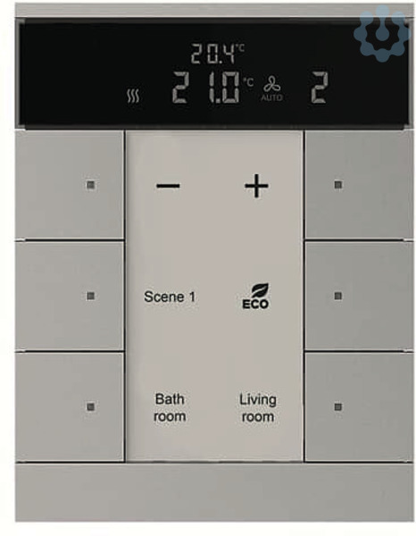 Frei konfigurierbares Multifunktionsbedienelement. Raumtemperaturbedienelement/Reglernebenstelle mit max. 6-fach Bedienelement Mit Beschriftungsfeld. Transparenter Beschriftungsbogen mit Standardsymbolen in der Lieferung enthalten. Unterstützung der KNX-Funktionen durch innovatives Farbkonzept (gelb=Beleuchtung, blau=Jalousie, orange=RTR, magenta=Szene und weiß=neutral/keine Funktionszuordnung) oder Standardbeleuchtung rot/grün. Tasterfunktion (Schalten/Dimmen/Jalousie/Wert senden/Lichtszenen/Lüftungsfunktion) Mit integriertem Temperaturfühler. Mit Temperaturanzeige IST-Wert Mit Temperaturanzeige SOLL-Wert. Der Busanschluss erfolgt über die beiliegende Busklemme. Mit integriertem KNX-Busankoppler. Anzahl Busteilnehmer: 1