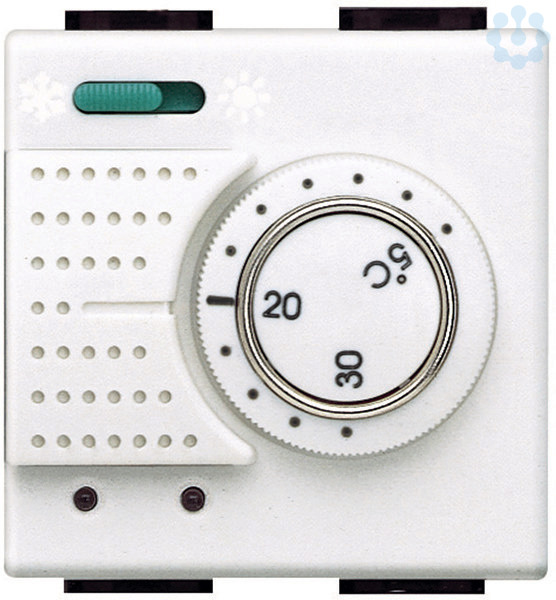 Elektronischer Raumthermostat mit frontseitigem Umschalter „Heizung/Klima“, Temperaturbereich 5–30 °C, Schließerkontakt 2A/250VAC, Stromversorgung 230VAC, Farbe: Weiß