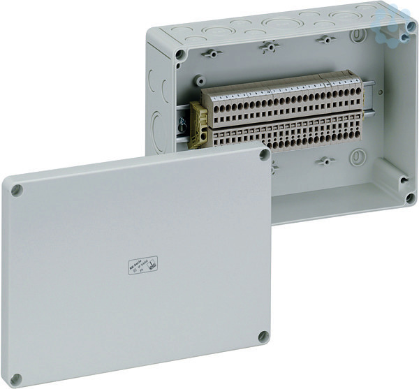 Reihenklemmengehäuse, mit Schutzart IP54/IP66, Nennquerschnitt 4mm², Ui=400V AC, Polystyrol, innenliegende Befestigungsstellen, für Standardinstallationen im Innenbereich, bestückt mit 25 schraubenlosen Klemmen 4mm³ (Typ Weidmüller ZDU 4)