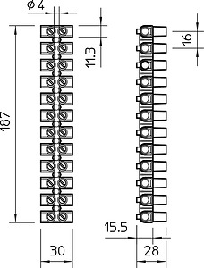 Klemmen Messing, Schrauben Stahl, galvanisch verzinkt und transparent passiviert, 12-polige, in Einzelklemmen abtrennbare Leisten.