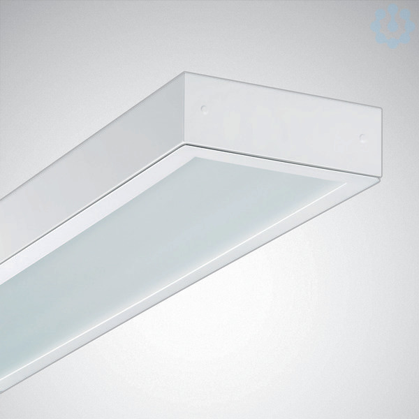 Reinraum-Anbauleuchte. mit integriertem LED-System. Leuchte mit begrenzter Oberflächentemperatur gemäß DIN EN 60598-2-24 für den Einsatz in feuergefährdeten Betriebsstätten geeignet (D-Kennung). Anbauleuchte für die Deckenmontage. In Verbindung mit einem Einbaurahmen (optionales Zubehör) kann die auch als Einbauleuchte in gesägten Deckenöffnungen zu verwenden. Mit symmetrisch strahlender Lichtstärkeverteilung. Blendungsbewertung nach UGR-Einstufung (EN 12464-1) < 22. Leuchtenabdeckung aus hochwiderstandsfähigem Verbund-Sicherheitsglas, satiniert. Oberfläche zur Vermeidung unkontrollierter Reflexionen bei Einsatz von Lasertechnik fein strukturiert. Bemessungslichtstrom 6800 lm, Bemessungsleistung 66,00 W, Leuchten-Lichtausbeute 103 lm/W. Lichtfarbe neutralweiß, ähnlichste Farbtemperatur (CCT) 4000 K, allgemeiner Farbwiedergabeindex (CRI) Ra > 90. Mittlere Bemessungslebensdauer L80(tq 25 °C) = 70.000 h, mittlere Bemessungslebensdauer L85(tq 25 °C) = 50.000 h. Leuchtenkörper aus Stahlblech. Oberfläche weiß beschichtet (RAL 9016). Maße (L x B): 1248 mm x 296 mm, Leuchtenhöhe 100 mm. Innen liegende Schleifkontaktverschlüsse beziehen den Rahmen selbsttätig in die elektrische Schutzmaßnahme ein. Zulässige Umgebungstemperatur (ta): -20 °C - +25 °C. Schutzklasse (EN 61140): I, Schutzart (DIN EN 60529): IP65, Stoßfestigkeitsgrad nach IEC 62262: IK08, Prüftemperatur Glühdrahttest gemäß IEC 60695-2-11: 650 °C. Anschlussfertig verdrahtet, 2 Kabelverschraubungen beiliegend. Mit elektronischem Betriebsgerät, digital dimmbar (DALI). Die Leuchte ist Monitoring ready (MOR), liefert Leuchtendaten zur Überwachung oder vorausschauenden Wartung und ist damit kompatibel zu den TRILUX Digital Services (Energy Monitoring und Light Monitoring). Das Produkt erfüllt die grundlegenden Anforderungen der anwendbaren EU-Richtlinien und des Produktsicherheitsgesetzes und trägt die CE-Kennzeichnung.