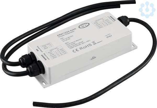 Power-Repeater für Unicolor- und RGB-LED-Leuchten. Der Repeater kann an nahezu allen LED-Dimmer und RGB- bzw. RGBW-Steuerungen angeschlossen werden, um die jeweiligen Signale zu erweitern und dadurch auch größere Beleuchtungsszenarien mit nur einer Steuerung synchron betreiben zu können. Geeignet für Leuchten mit einer Betriebsspannung von 12, 24 und 36V/DC. Die tatsächlich zu verwendende Eingangsspannung ist abhängig von der benötigten Spannung der angeschlossenen Leuchten. 1x Eingang für 12-36V/DC (Kabellänge 40cm), 5x Eingang für die Steuerleitungen (+,RGBW, Kabellänge 40cm) und 5x Ausgang (Signal 1-4 und gemeinsamer Pluspol, Kabellänge 40cm). Technische Daten: ta: -20°C - 50°C, tc: 75°C, max. Ausgangsleistung je Kanal: 5A (60W bei 12V/DC, 120W bei 24V/DC und 180W bei 36V/DC).