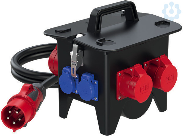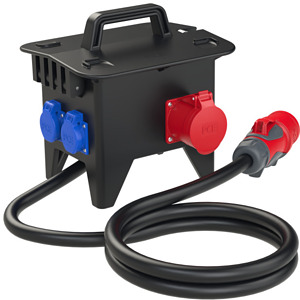 Mobiler Vollgummiverteiler Modell RIED IP54 285x235x281; 2m Kabel H07RN-F 5G6mm2 schwarz mit Stecker 32A 5p 400V; 1xCEE-Steckdose 32A 5p 400V abgesichert d. Vorsicherung Zuleitung; 2xCEE-Steckdose 16A 5p 400V abgesichert ü. 1xLS 16A 3p C; 4xSK-Steckdose 16A 250V IP54 abgesichert ü. 2xLS 16A 1p C; 1xFI 63A/4/0.03A (TYP A 40AT) über alle Ausgänge; Leitungsschutzschalter und FI Fabrikat Eaton ÖVE / VDE; Verteiler betriebsfertig angeschlossen;