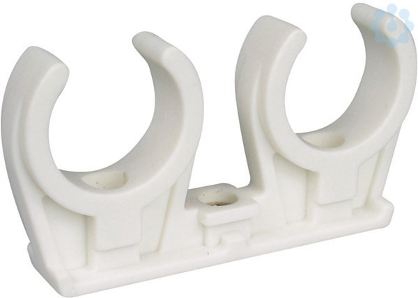 Walraven Rohrclip aus weißem (RAL 9016) Polypropylen (PP) mit M6-Messinggewinde befestigt zwei Rohre, Brandklasse B2, korrosions-, halogenfrei, recyclebar, UV-, alterungsbeständig, temperaturbeständig -30 bis +90 Grad, Durchmesser je 20 bis 22 Millimeter.
