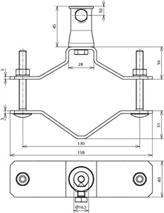 Rohrschelle mit Befestigungsbuchse für Distanzstab (D16 mm), für Rohre bis Durchmesser 90 mm.