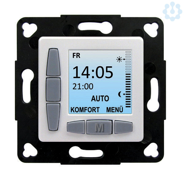 Elektronisch digitale Zeitschaltuhr mit grafischem LCD Display 1,7", mit Astro-Funktion und farbiger Hintergrundbeleuchtung (7 verschiedene Farben einstellbar) im 50 x 50 mm Maß, zum integrieren in fast alle gängigen Schalterprogramme, Farbe ultraweiß, zur Programmierung von Tages- und Wochenprogramm mit je 1 Auf- und Abschaltzeit, manueller Schaltmöglichkeit mit Stoppfunktion und Tippbetrieb, Wende-/Lüftungsfunktion 0-5 Sek. einstellbar, Urlaubsschaltung mit zufälliger Verschiebung der Schaltzeiten um 1-30min., einstellbare Komfortposition zur Abschattung, Anschlußmöglichkeit über Klinkenstecker für optionalen Sonnen- Dämmerungssensor, Sonnenfunktion 5-70 kLux und Dämmerungsfunktion 1-500 Lux einstellbar, automatische Umstellung Winter-/Sommerzeit, Motorlaufzeit 0- 180 sek. einstellbar, Gangreserve 72 Stunden, Schaltleistung 3 A / 230 V/50 Hz, inkl. Abdeckrahmen IP40