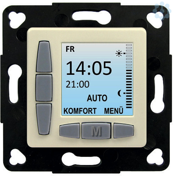 Elektronisch digitale Zeitschaltuhr mit grafischem LCD Display 1,7", mit Astro-Funktion und farbiger Hintergrundbeleuchtung (7 verschiedene Farben einstellbar) im 50 x 50 mm Maß, zum integrieren in fast alle gängigen Schalterprogramme, Farbe weiß, zur Programmierung von Tages- und Wochenprogramm mit je 1 Auf- und Abschaltzeit, manueller Schaltmöglichkeit mit Stoppfunktion und Tippbetrieb, Wende-/Lüftungsfunktion 0-5 Sek. einstellbar, Urlaubsschaltung mit zufälliger Verschiebung der Schaltzeiten um 1-30min., einstellbare Komfortposition zur Abschattung, Anschlußmöglichkeit über Klinkenstecker für optionalen Sonnen- Dämmerungssensor, Sonnenfunktion 5-70 kLux und Dämmerungsfunktion 1-500 Lux einstellbar, automatische Umstellung Winter-/Sommerzeit, Motorlaufzeit 0- 180 sek. einstellbar, Gangreserve 72 Stunden, Schaltleistung 3 A / 230 V/50 Hz, inkl. Abdeckrahmen IP40