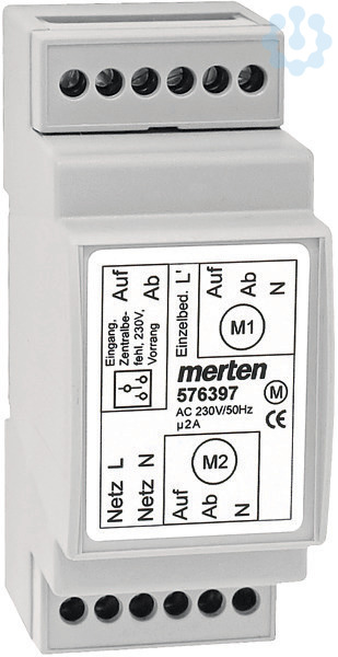 Zur Steuerung von bis zu 2 Rollladenmotoren vor Ort, in Gruppen oder zentral. Mit Trennung von Last- und Steuerkreis sowie Zwangsverriegelung in beiden Laufrichtungen. Einzelbedienung der Motoren erfolgt über einen Rollladen-Wipptaster, zentrale Steuerungen über Jalousie-Zeitschaltuhren oder Jalousie-Taster des Merten-Jalousiesteuerungssystems. Für die Montage auf Hutschienen TH35 nach EN 60715. Netzspannung AC 230 V, 50 Hz +/-10%. Stromaufnahme 10 mA im Relaisbetrieb. Schaltspannung max. AC 250 V. Schaltstrom max. 2 A. Temperaturbereich 0-60 GradC. Klemmen max. 1,5 mm². Gerätebreite 2 TE entspricht ca. 36 mm.