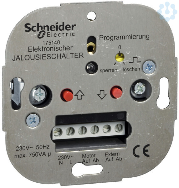 Elektronischer Rollladenschalter programmierbarer Steuereinsatz für Rollladen/Markise Nennspannung: 230 V, +6/-10%, 50 Hz Leistung: max. 750 VA, je ein automatischer Auf- und Abbefehl im 24h Rhythmus speicherbar (Speicherung deaktivierbar), automatischer Auf-/Abbefehl abschaltbar, Gangreserve ca. 1 h, Impulsdauer 180 s externer Eingang 230 V für Vernetzung (Zentral- und Gruppensteuerung), Nebenstellenbetrieb oder Sensoranschluss (nur einphasiger Betrieb zulässig, nicht potentialfrei).