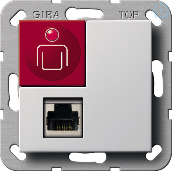 Ruftaster mit Nebensteckkontakt System 55 Reinweiß glänzend Merkmale: Ruf- bzw. Notrufauslösung über rote Ruftaste mit Finde- bzw. Beruhigungslicht. Buchse für Ruf- bzw. Notrufauslösung über ein angeschlossenes Bediengerät. Rufkreisüberwachung bei Steckerabwurf.