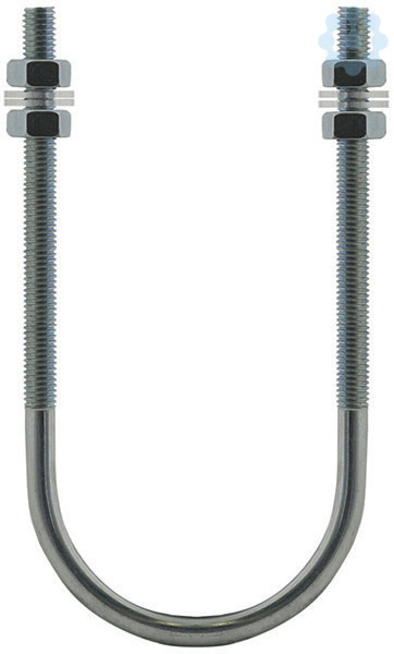 Walraven Rundstahlbügel lang aus elektrolytisch verzinktem (ev) Stahl ist ein gebogener Rundstahl mit zwei 90 Millimeter langen Gewinden M8 zur Befestigung von Stahlrohren mit 60,3 Millimeter Durchmesser, inklusive je vier Muttern und Unterlegscheiben.