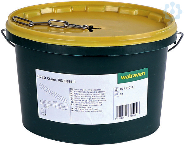 30 Meter lange langgliedrige Kette nach DIN 5685-1 aus Edelstahl 1.4301 (AISI 304, V2A) im praktischen Kunststoffeimer mit Ausschnitt im Deckel zum einfachen Lagern und Entnehmen, Kettengliedlänge innen 26, Kettengliedbreite innen 5,4 Millimeter.