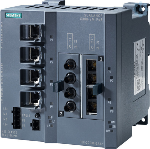 SCALANCE X308-2M PoE, managed IE Switch, kompakt, 4x 10/100/1000 Mbit/s für RJ45 Ports elektrisch mit PoE, 2x 100/1000 Mbit/s für 2-Port-Medienmodule, elektrisch oder optisch, LED-Diagnose, Fehlermelde- Kontakt mit Select/Set-Taster, PROFINET IO Device, Netzwerk- Management, integrierter Redundanz-Manager, Office Features (RSTP, VLAN, IGMP,..) C-PLUG im Lieferumfang. SCALANCE X308-2M PoE Managed, Layer 2 Kompakt Switch, 4x 10/100/1000 Mbit/s RJ45 PoE, 2x 100/1000 Mbit/s für Medienmodule für Versorgung PoE-fähiger Geräte. Schaltschrank-Switch SCALANCE X308-2M PoE flexibel und platzsparend: Die nächste Generation der industriellen Netzwerke verbindet OT und IT für eine flexiblere und sicherere Produktion. Mit unseren Ethernet Switches SCALANCE X-300 als Kompaktgeräte oder als 19-Switches für den Schaltschrank profitieren Sie dabei von hoher Funktionalität und großer Flexibilität mit Industrial Edge und zukünftig auch mit Time-Sensitive Networking (TSN). Profitieren Sie von der Vielfalt unserer Gerätelinie SCALANCE X-300: Von Schaltschrank-Switches für den Einsatz in industrienahen Umgebungen über Ethernet Switches im kompakten Design bis hin zu Switches für extrem raue Industrieumgebungen: Mit SCALANCE X308-2M finden Sie für viele Anwendungen den richtigen Switch.
