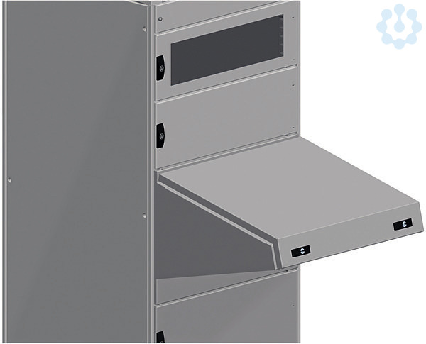 Spacial SF Schaltpult. Für Gehäusebreiten 800 mm. Schnittstellenzubehör. Steuerpult mit Verriegelungssystem. Montage an der Vorderseite des Gehäuses. Zwischenhalterung für die Querträgerbefestigung. Verriegelung 3 mm Doppelbart. Polyamid 6 (30 % Glasfaser) für Schließsystem, Stahl für Leitstand. Pult Grau RAL 7035 Schließsystem Schwarz.